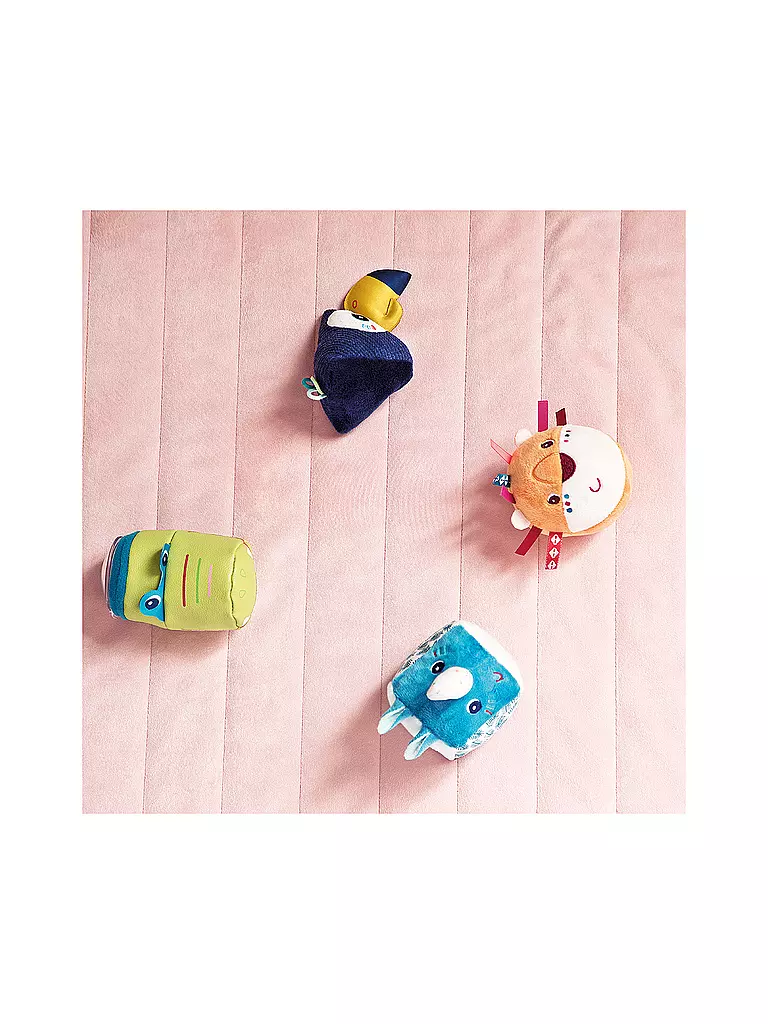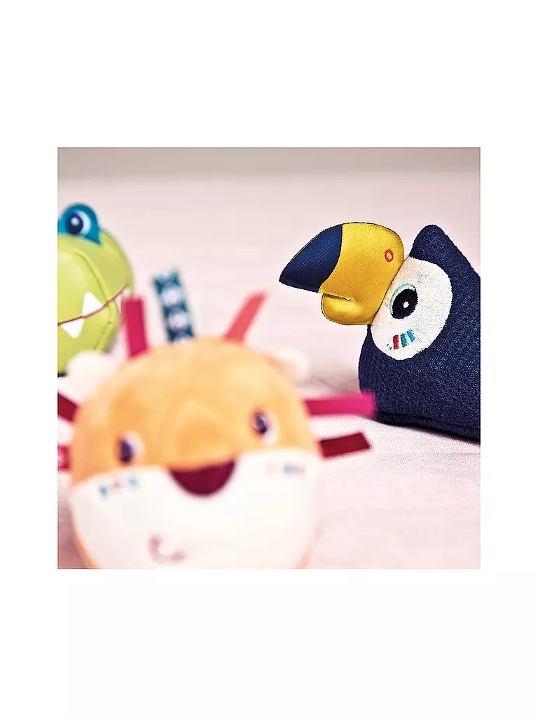 Diese „Rasselbande“ aus weichen, farbenfreudigen Dschungeltieren ist variantenreich: Jede der vier Rasseln hat eine andere geometrische Form und bietet eine Vielzahl von Themen und Aktivitäten.