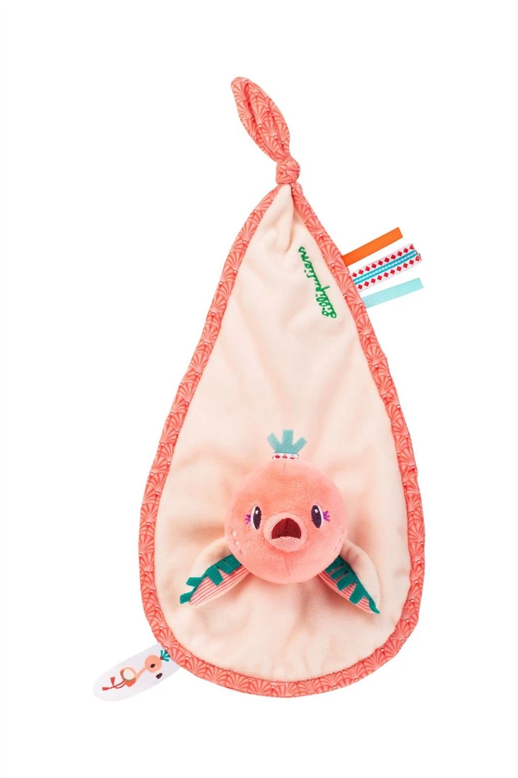 Beruhigendes Schnuffeltuchtier, das tröstet und erheitert. Mit einem Fingerpuppenkopf, der das Schuffeltuch lebendig werden lässt und abstehenden Schildchen, die Tastsinn und Feinmotorik anregen.
