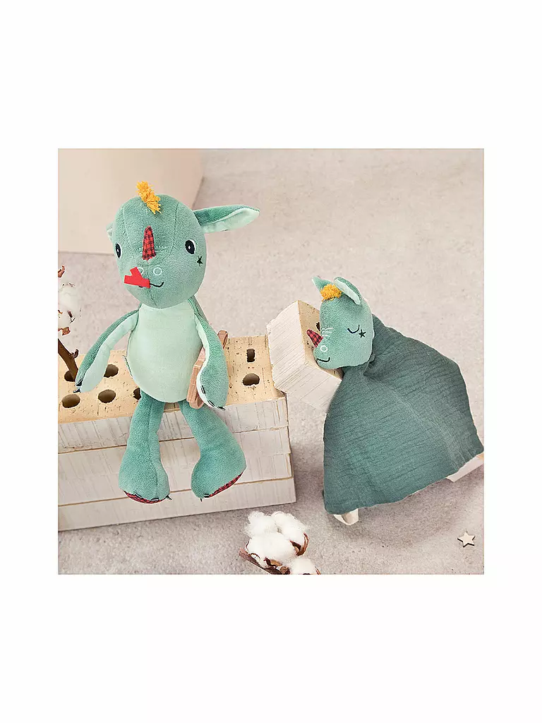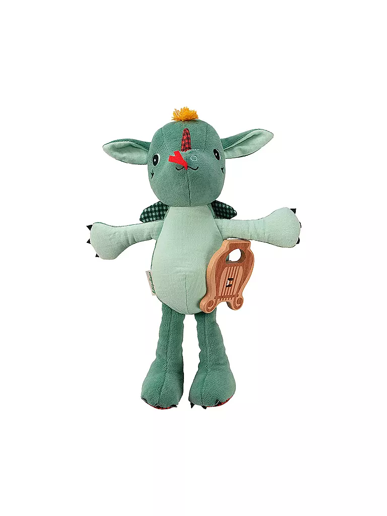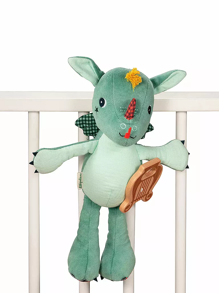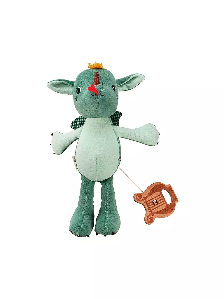 Joe zaubert die schönsten Töne aus seiner Holzharfe. Zur sanften Melodie von Greensleeves begleitet er die Kleinsten ins Land der Träume. Das Musikkuscheltier kann in der Waschmaschine gewaschen werden. Zu diesem Zweck müssen die Holzharfe und die Musikdose zuerst entfernt werden.