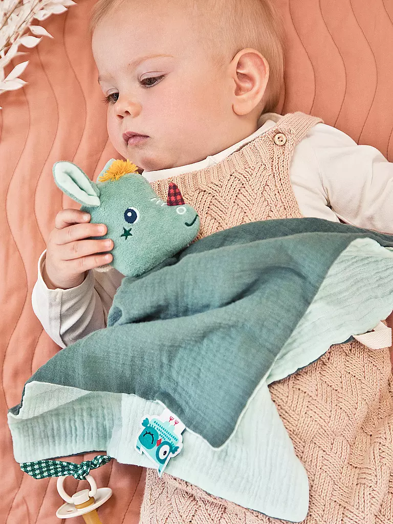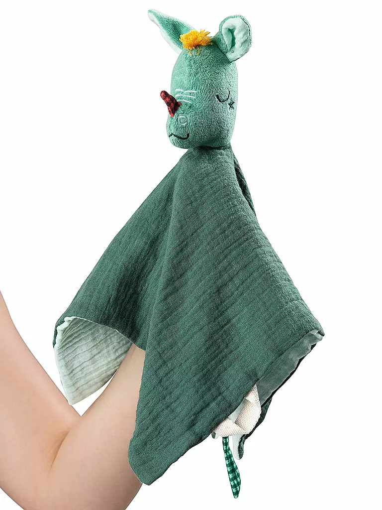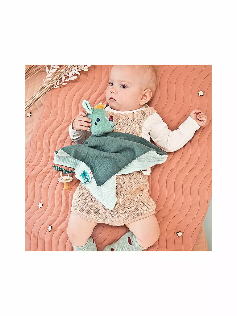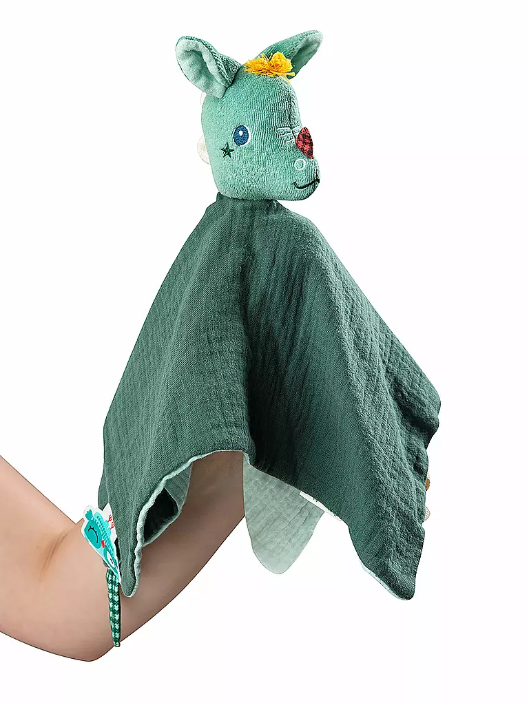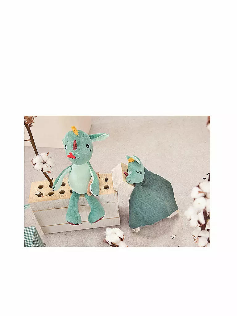 Joe zaubert die schönsten Töne aus seiner Holzharfe. Zur sanften Melodie von Greensleeves begleitet er die Kleinsten ins Land der Träume. Das Musikkuscheltier kann in der Waschmaschine gewaschen werden. Zu diesem Zweck müssen die Holzharfe und die Musikdose zuerst entfernt werden.
