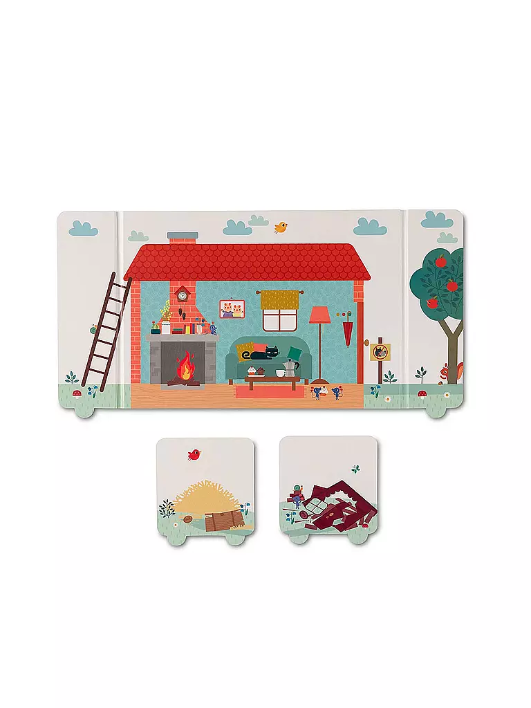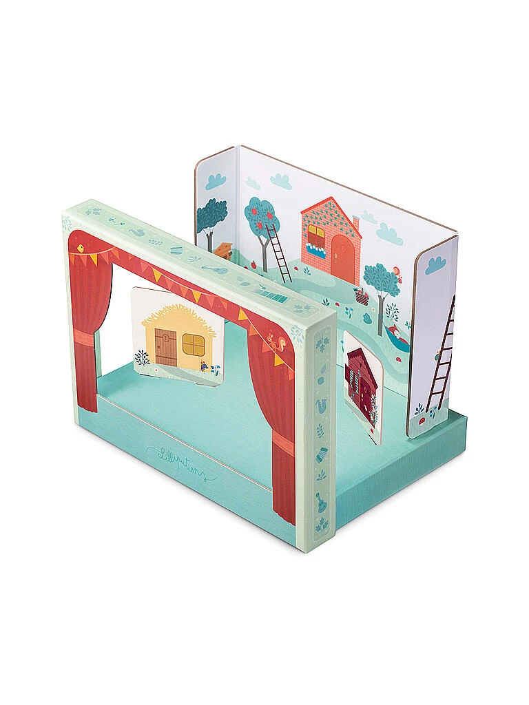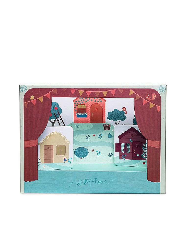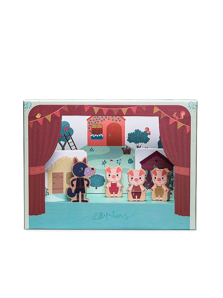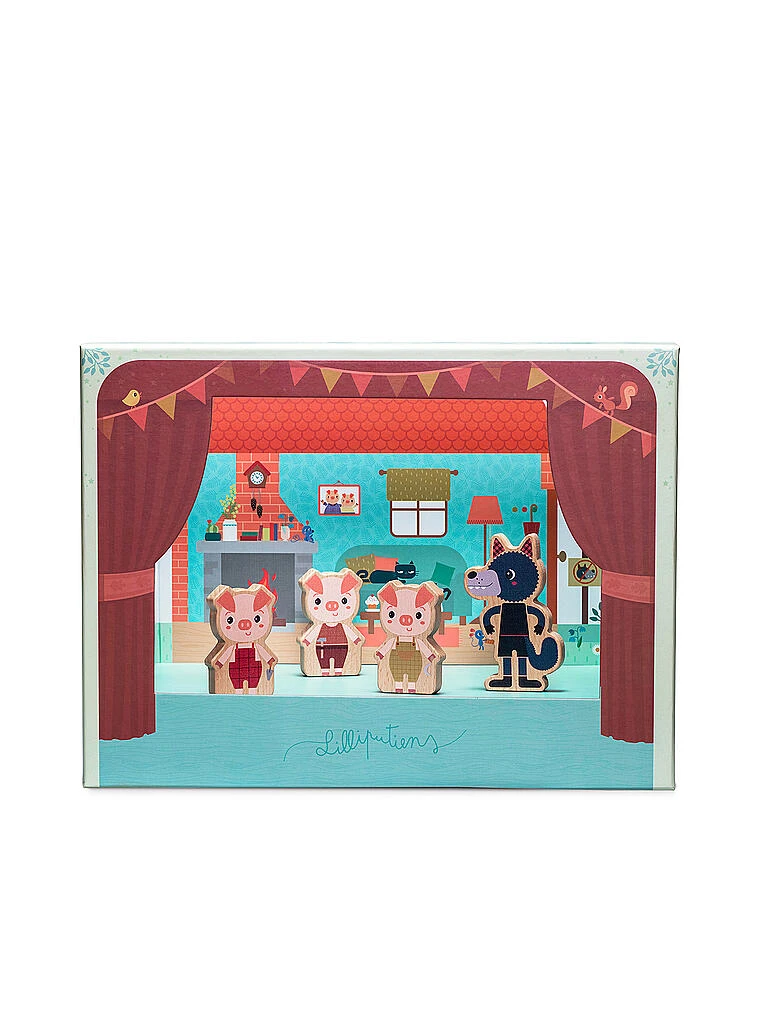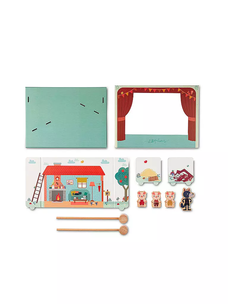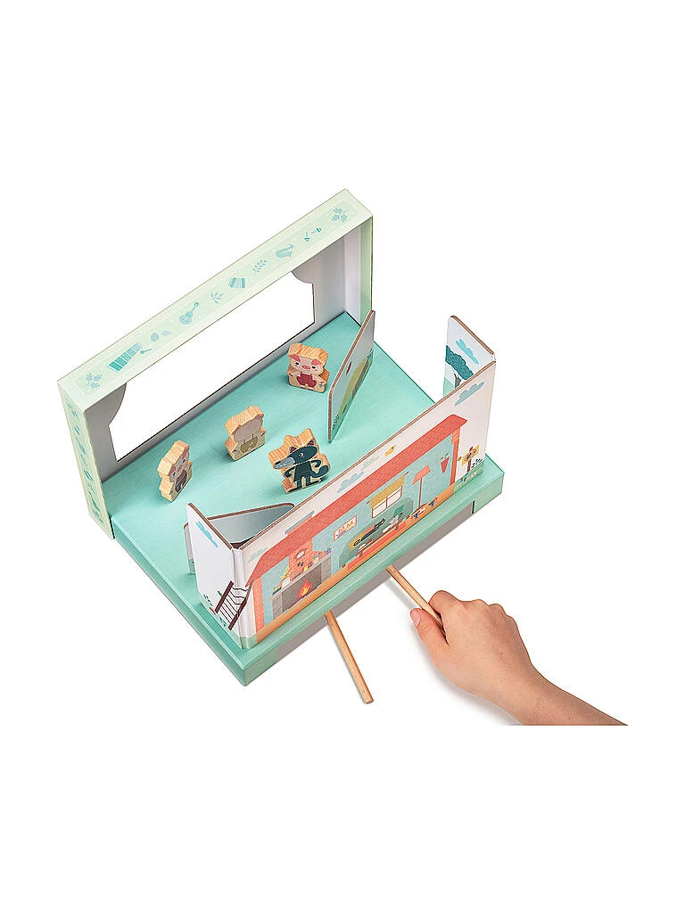 Mit diesem tollen Theater spielen Sie die Geschichte von Der Wolf und die 3 Schweinchen nach oder denken sich Ihre eigene Geschichte aus! Die Holzfiguren bewegen sich durch 2 Holzstäbe mit Magnet über die Szene, zwischen den wunderschön illustrierten Kulissen. Die Schachtel wird im Handumdrehen in ein Theater umgebaut. Die Kulissen sind zweiseitig, damit Sie mehrere Szenen erschaffen können. 4 Holzfiguren werden durch die magnetisierten Stäbe auf der Bühne zum Leben erweckt: der Wolf und die 3 Schweinchen.