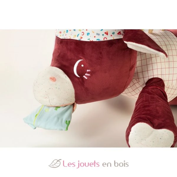 Rosalie die Kuh betrachtet einen kleinen Vogel, der gerade auf ihrem Rücken gelandet ist. Sein Körper bietet eine Vielzahl überraschender Aktivitäten für die Kleinen. Pssst… Versteck deinen Schlafanzug oder deine kleinen Geheimnisse in seinem großen Maul.